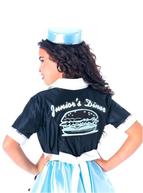 This cute costume includes a dress with a dark blue shirt and celestial blue flared skirt. The dress has 'Junior's Diner' printed on the chest and back, with a huge hamburger. The costume is completed by a matching hat and a white flared apron.