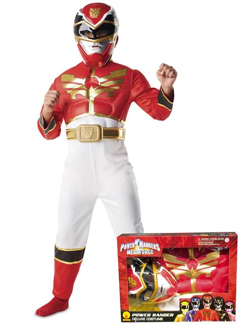 This brave Power Ranger costume includes a red and white muscular jumpsuit with golden details. The costume also comes complete with a gold belt and a red mask.